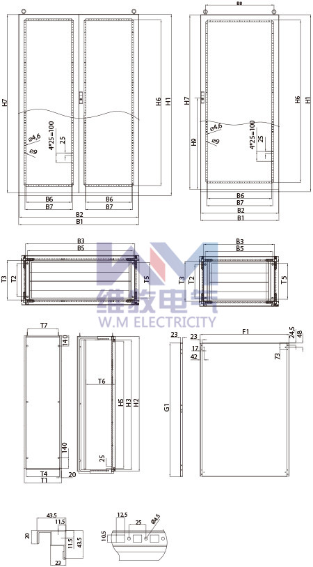 材料: SUS304 (其它材料型號(hào)可 選) 表面處理: 拉絲,安裝板則為鍍鋅Wire 防護(hù)等級(jí): IP54 (按GB4205-1993) 標(biāo)準(zhǔn)配置: 前門(mén)、背板、安裝板、柜 體、密封條、門(mén)鎖、側(cè)板(可 選件) 鋼板厚度: 框架:九折型材1.5mm 門(mén)板:2.0mm 背板、側(cè)板:1.5mm 安裝板:2.5mm (可選3.0mm) |