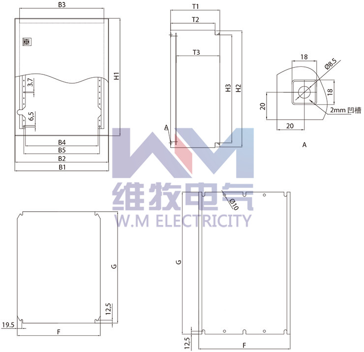 材料: SUS304 (其它材料型號可選) 表面處理: 拉絲,安裝板則為鍍鋅 防護(hù)等級: IP56(按GB4205-1993) 標(biāo)準(zhǔn)配置: 門板、箱體、密封條、接地套 件、安裝板、門鎖 鋼板厚度: 箱體: 1.5mm(可選2.0mm) 門板: 2.0mm 安裝板: 2.5mm |